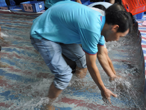 賽前的緊張氣氛,讓圍觀的人都屏住呼吸,參賽者卷起褲腳,眼神迸發出強烈決勝火花。隨著哨聲響起,鮮魚瞬間傾盆而入,魚群簇擁而散,只見能手們爭相撲入水池,你爭我搶。“這邊有魚啊。”喊聲剛落,成群的參與者聞聲涌來,調皮的魚兒卻躲開抓捕,在腳間溜開。好不容易抓到,不料魚尾使勁一甩,又從手中滑走,更有員工在競逐間,滑倒在水池,弄得全身濕透,惹得大家哄堂大笑。看著一條條魚,被大家抓進了盤里,滿滿的成就感,綻放在濕透的臉龐上。“今晚要來一頓豐盛的全魚宴!”員工們拎著一袋袋成果,開心說道。