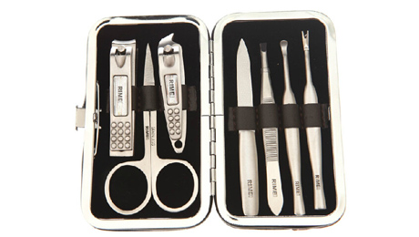 包裝規格:110mm*67mm*25mm 單套重量:133.2g 材質:PU+430不銹鋼 配件:RMT625E指甲鉗、美容剪、斜口指甲鉗、指甲銼、耳挖、死皮刀、眉夾