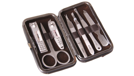 包裝規格:110mm*67mm*25mm 單套重量:131.6g 材質:PU+430不銹鋼 配件:RMT625E指甲鉗、美容剪、斜口指甲鉗、指甲銼、耳挖、死皮刀、眉夾